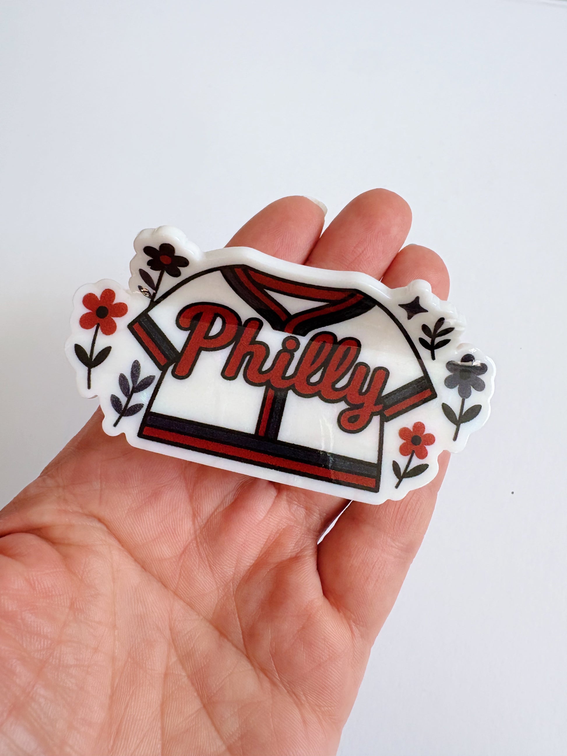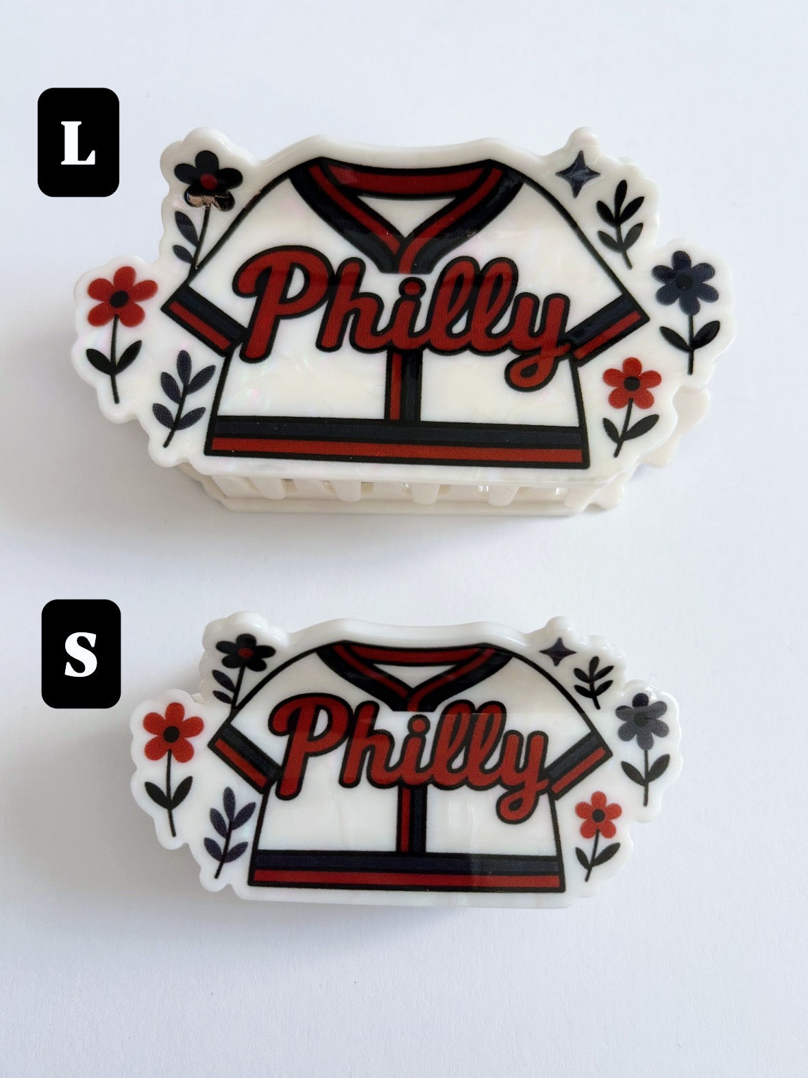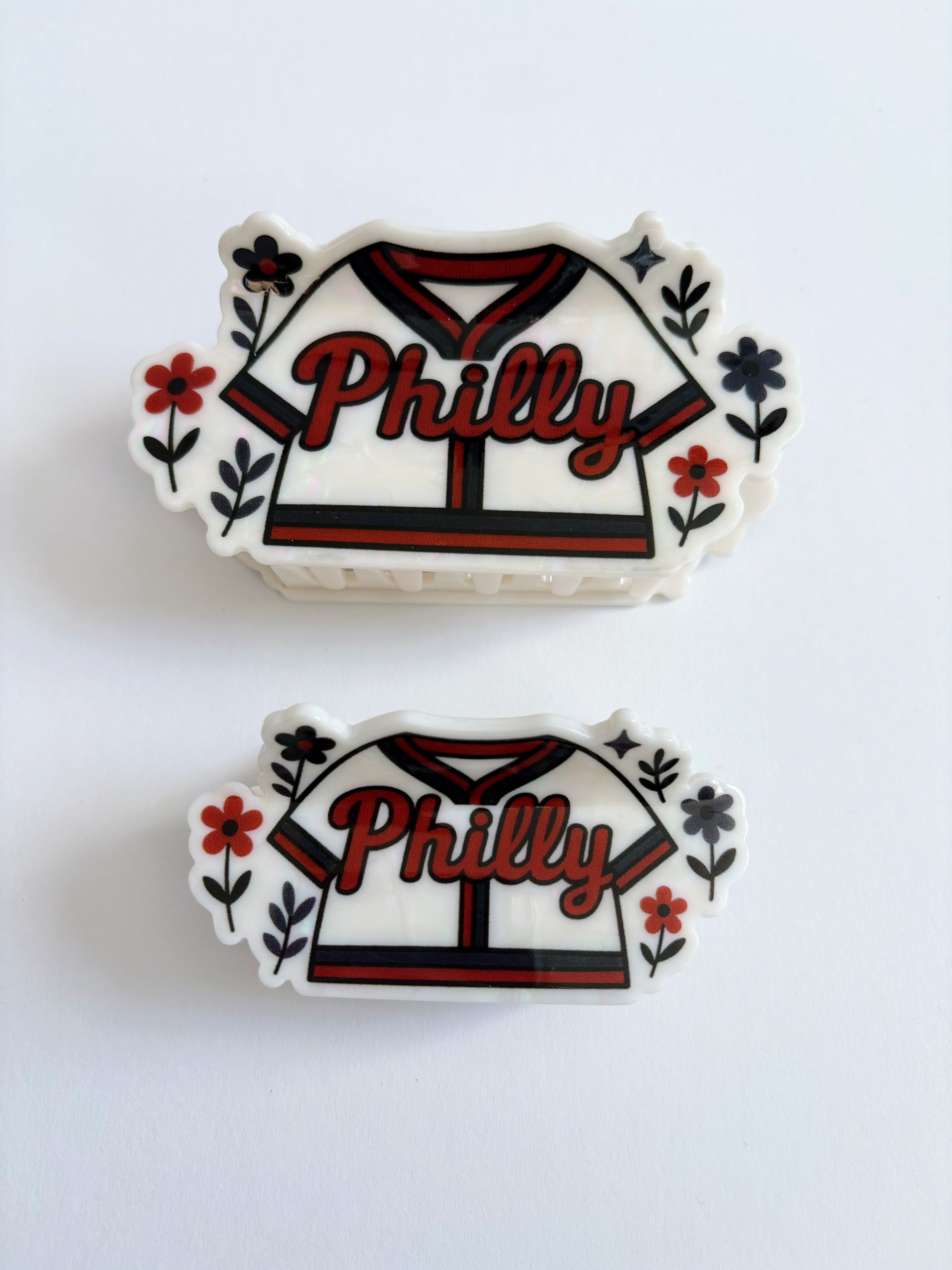 Small or Large hair claw designed in house by Geometric Gem for short - long hair. Philly and flowers are printed inside of the baseball t-shirt design.